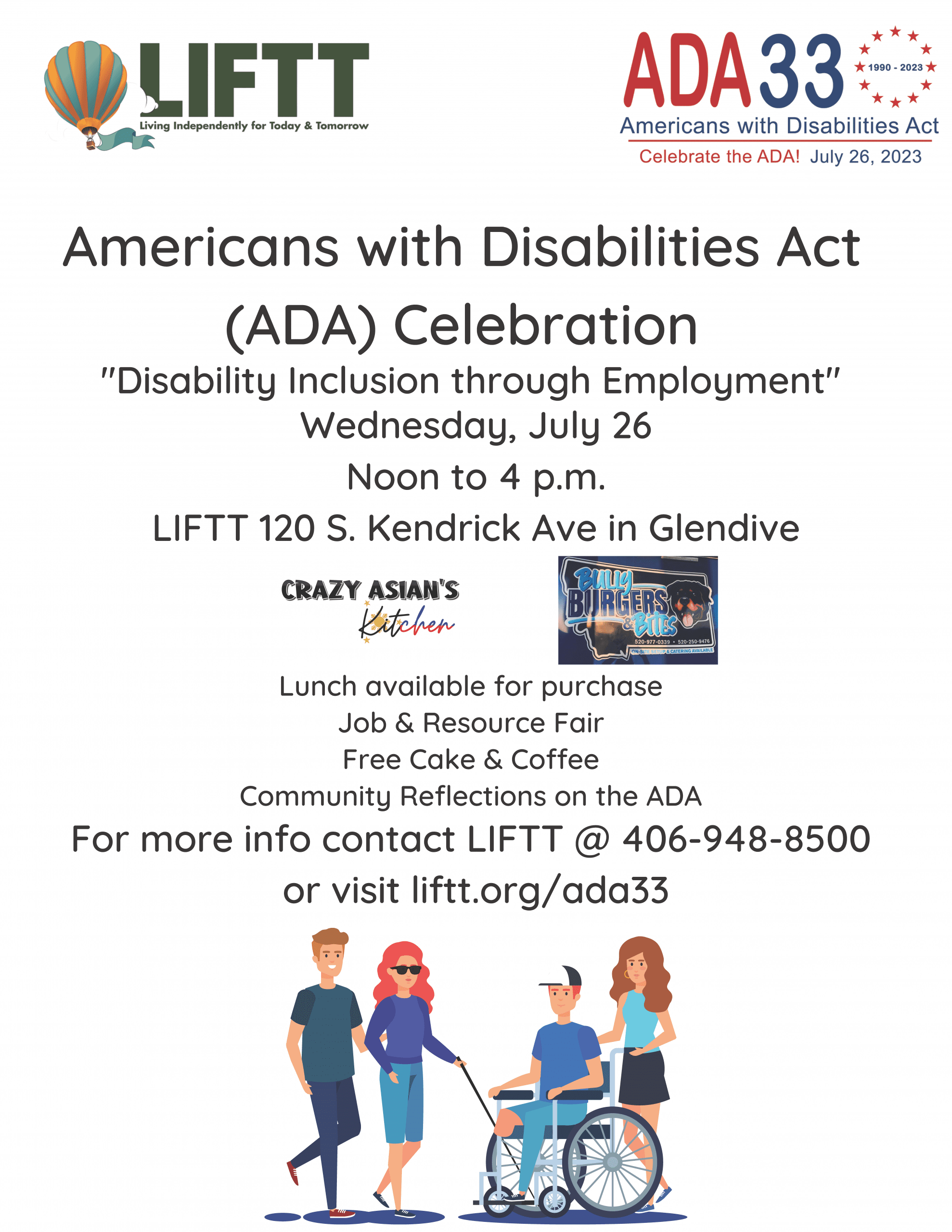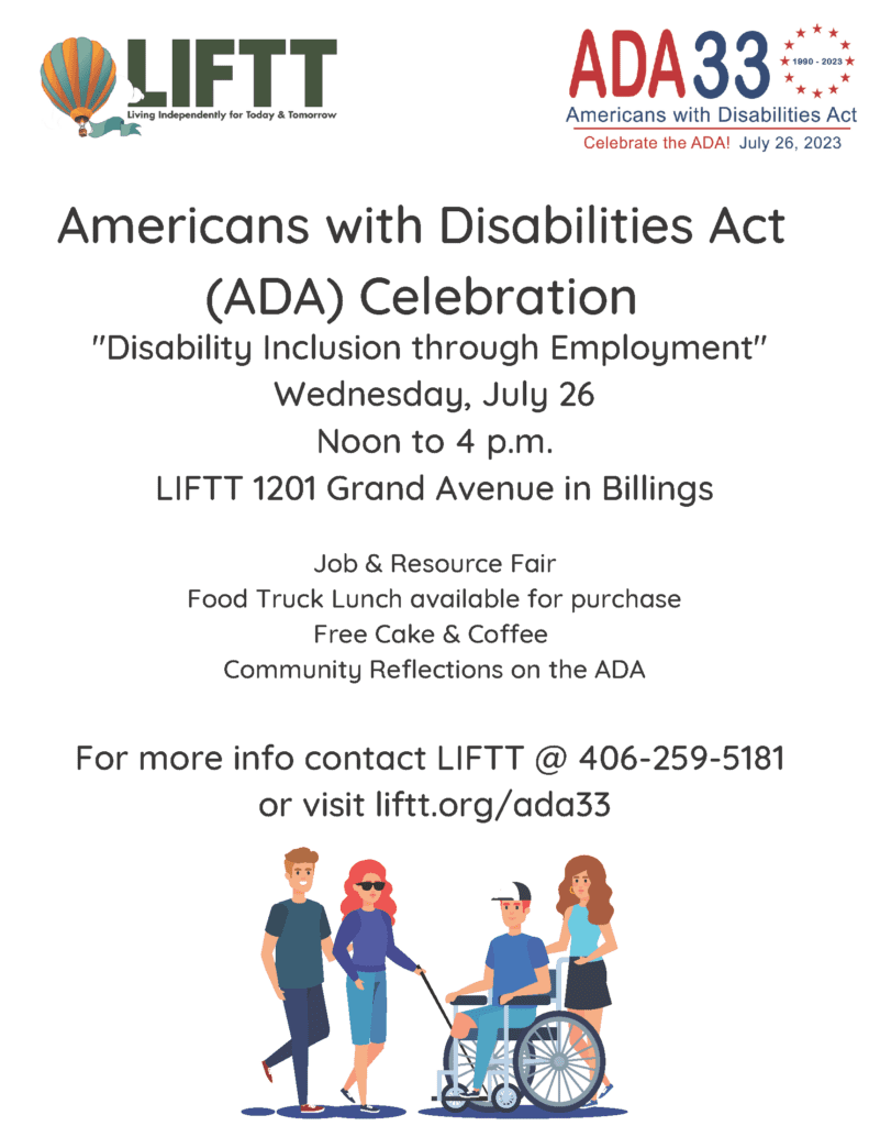 Living Independently for Today & Tomorrow (LIFTT) invites all to join us at our offices in Billings (1201 Grand Avenue) and Glendive (120 S. Kendrick Ave.) on Wednesday, July 26, 2023, for a celebration of the 33rd Anniversary of the signing into law of the Americans with Disabilities Act (ADA).