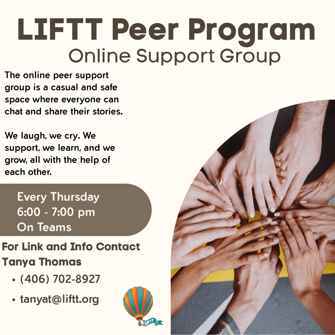 Join us every other Thursday from 6 p.m. to 7 p.m. on Microsoft Teams. For the login or more information, contact LIFTT Peer Program Coordinator Tanya Thomas at (406) 702-8927 or tanyat@liftt.org