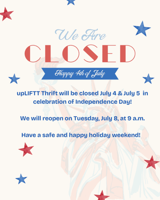 upLIFTT Thrift will be closed on Friday, July 4, and Saturday, July 5, in Celebration of Independence Day. We will reopen on Tuesday, July 8, at 9 a.m